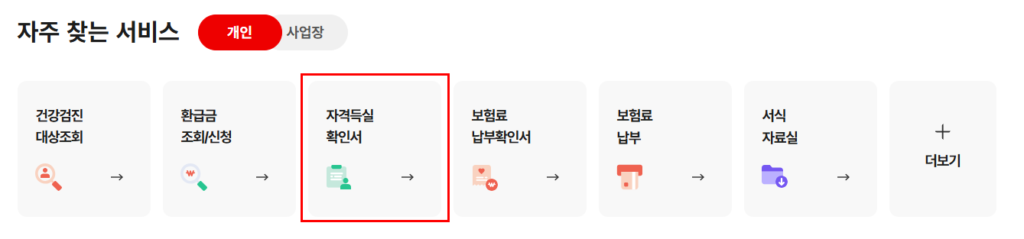 - 메인 화면 중앙의 ‘자주 찾는 서비스’에서 [자격득실확인서 발급] 아이콘을 클릭합니다.